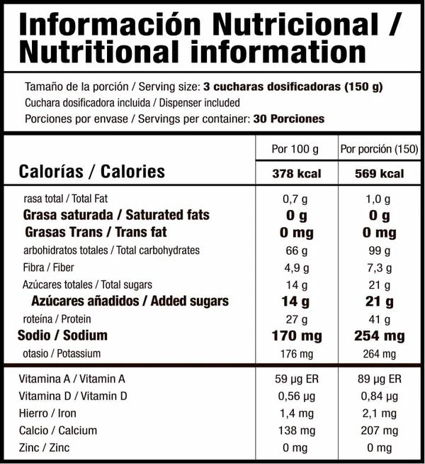 Su fórmula combina maltodextrina, proteína concentrada de suero, aislado de soya y creatina monohidratada, enriquecida con vitaminas y minerales esenciales. Todo en una textura cremosa, de excelente solubilidad y sabor delicioso.